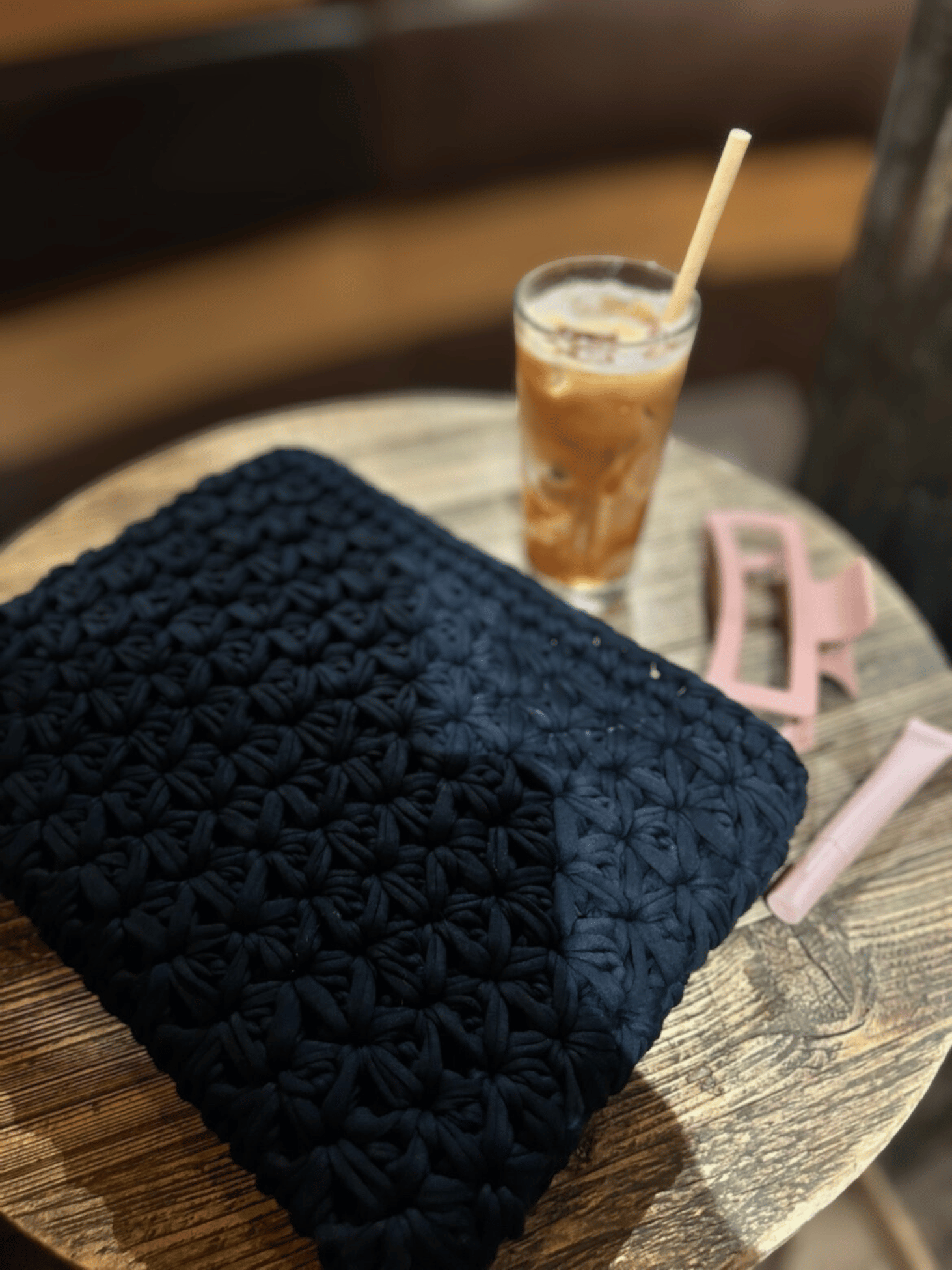 Garnet virkas för hand av oss på Tessuto UF till väskor och datorfodral. Varje produkt får ett eget produktionsnummer och vårt karakteristiska blommönster som är redo att användas i vardag och till fest.